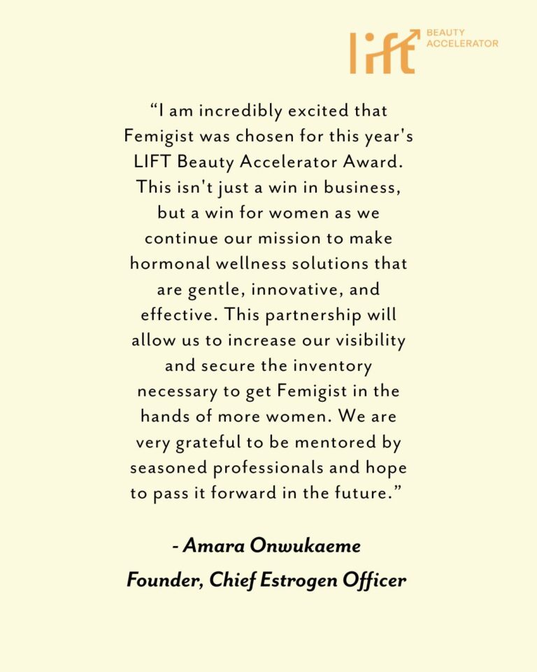 “I am incredibly excited that Femigist was chosen for this year’s LIFT Beauty Accelerator Award. This isn’t just a win in business, but a win for women as we continue our mission to make hormonal wellness solutions that are gentle, innovative, and effective. This partnership will allow us to increase our visibility and secure the inventory necessary to get Femigist in the hands of more women. We are very grateful to be mentored by seasoned professionals and hope to pass it forward in the future.”