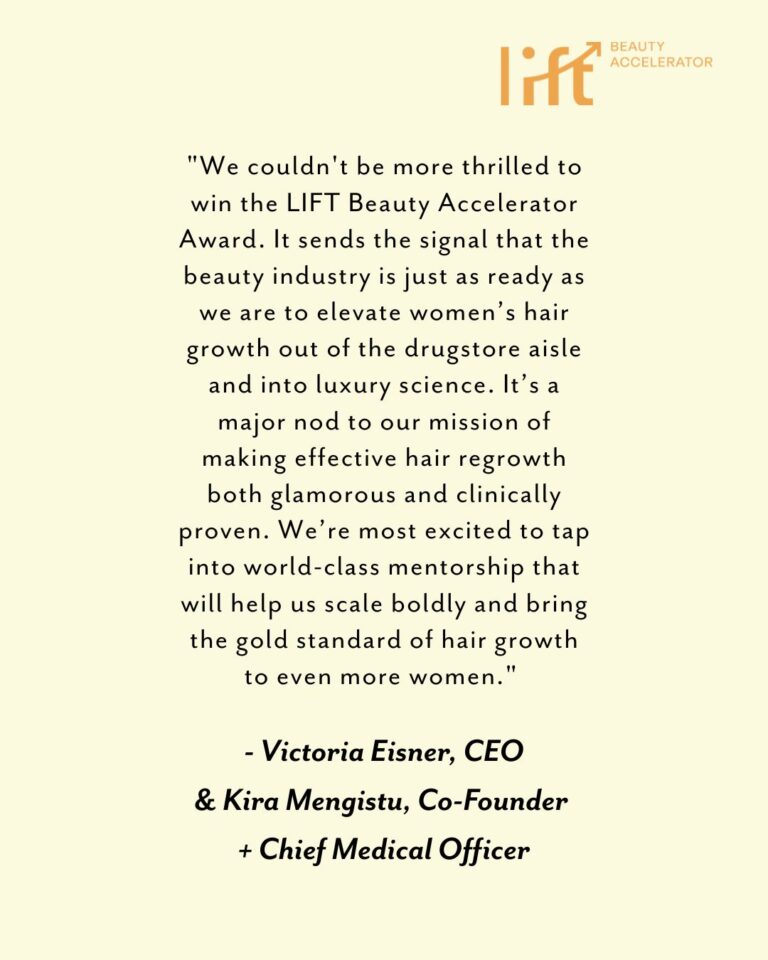 “We couldn’t be more thrilled to win the LIFT Beauty Accelerator Award. It sends the signal that the beauty industry is just as ready as we are to elevate women’s hair growth out of the drugstore aisle and into luxury science. It’s a major nod to our mission of making effective hair regrowth both glamorous and clinically proven. We’re most excited to tap into world-class mentorship that will help us scale boldly and bring the gold standard of hair growth to even more women.”